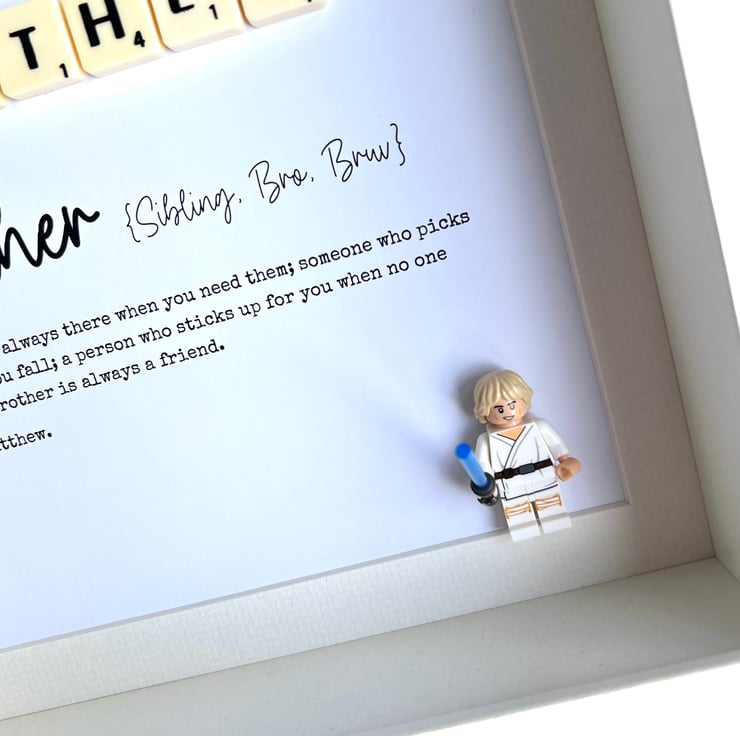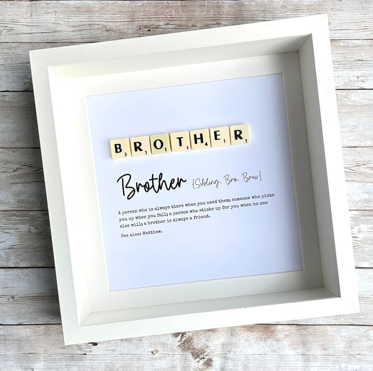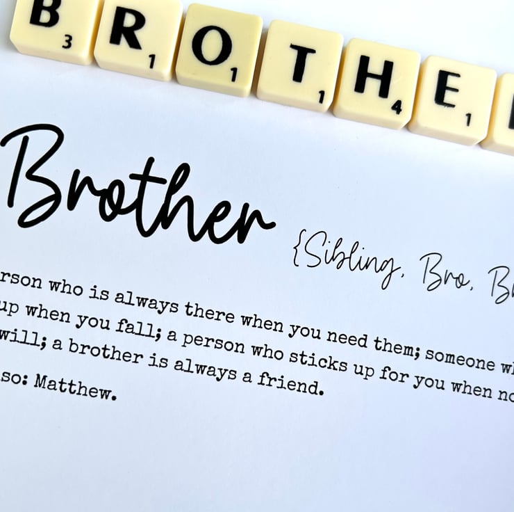 Spell out any name with the scrabble tiles, e.g. Bro, Bruv etc at the top of the frame and then add your own personalised text to the bottom of the frame.