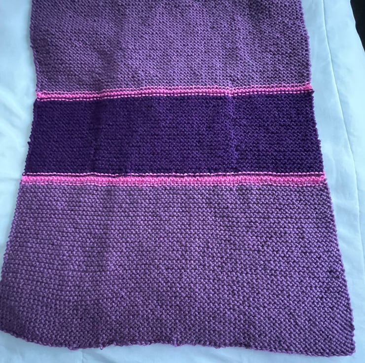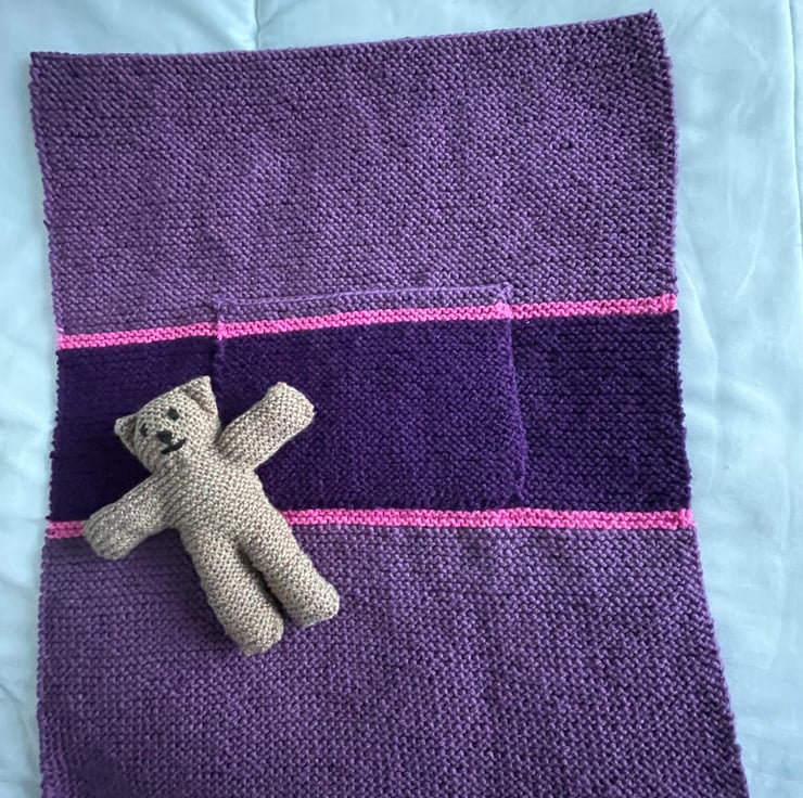 Hand knitted baby blanket with a pocket to put a small teddy. Ideal for crib or pram.