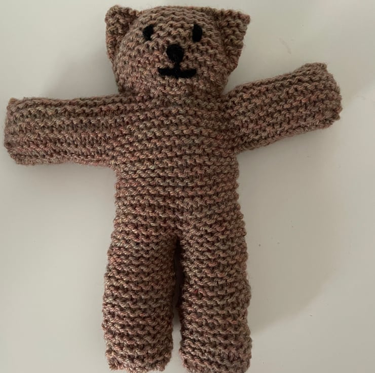 The teddy and blanket are knitted from DK yarn and the eyes are also in yarn.