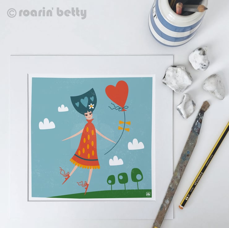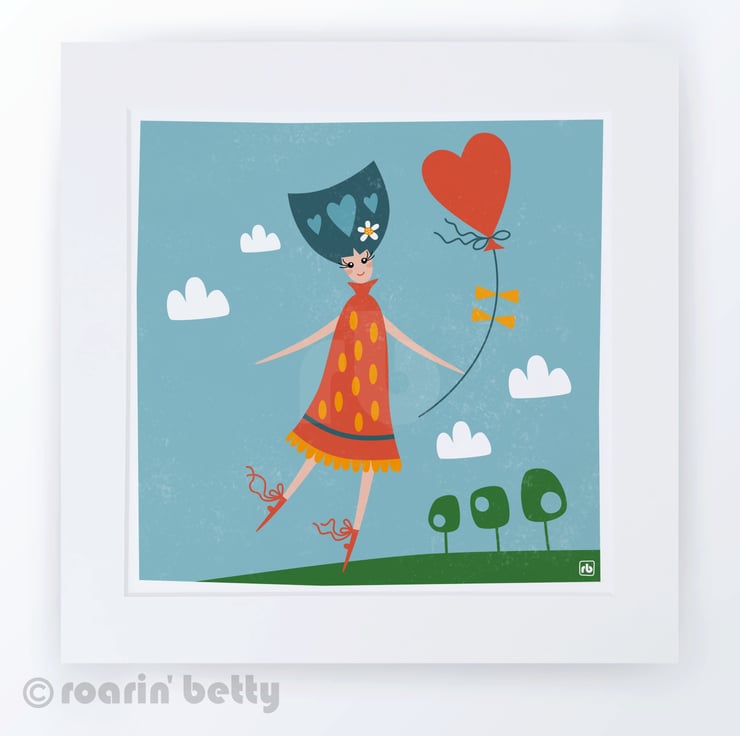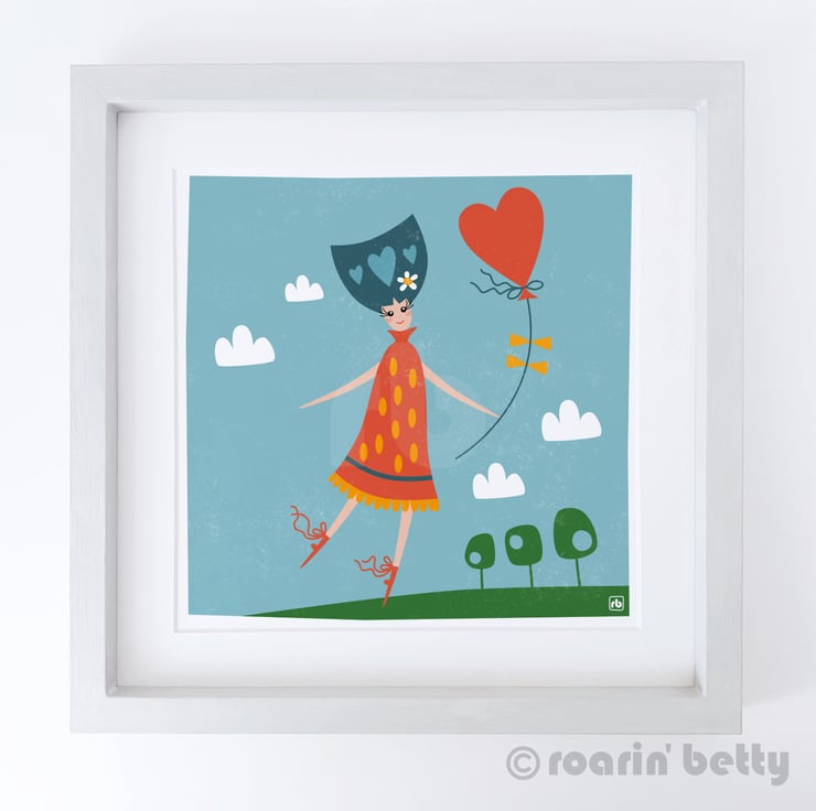 Giclee print of a girl flying through the air with a heart shaped balloon.