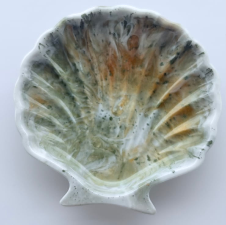 nspired by natural shell forms and weathered coastal tones, this piece was created to capture the softness of organic textures in resin. The layered greens and warm undertones echo sea-worn stone and woodland hues, blending earthy and coastal influences into a single sculptural form.