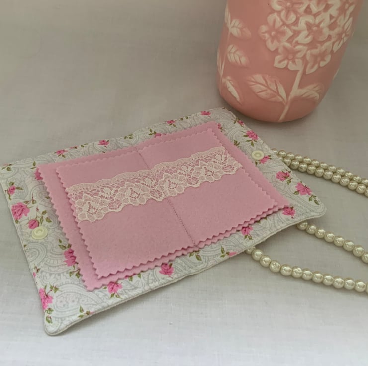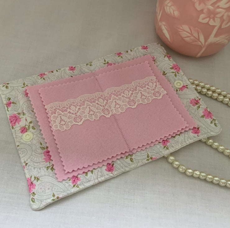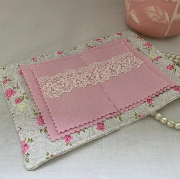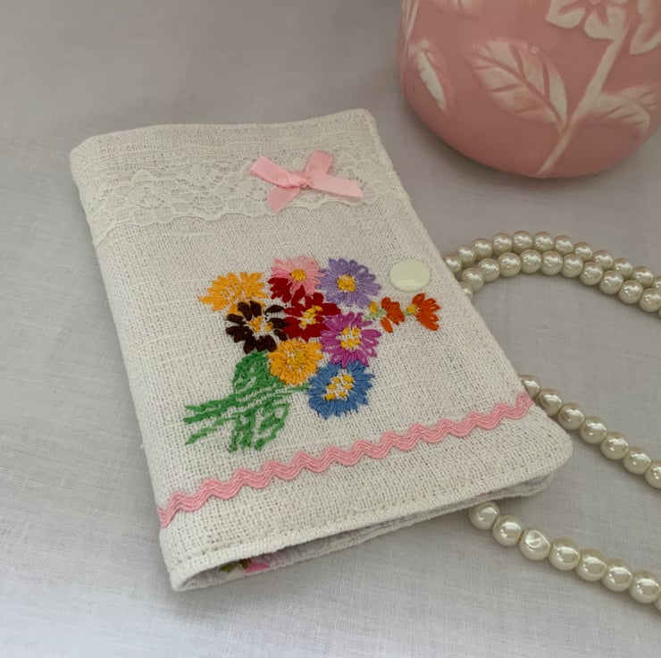 This beautiful handmade vintage needle case is a charming and functional accessory for sewing enthusiasts. Made from a beautiful hand embroidered vintage tablecloth which features a pretty flower detail. Inside, the case offers four felt pages on a vintage floral background, two with some decorative lace which are perfect for organising your needles or pins. The case closes securely with a plastic snap fastener.