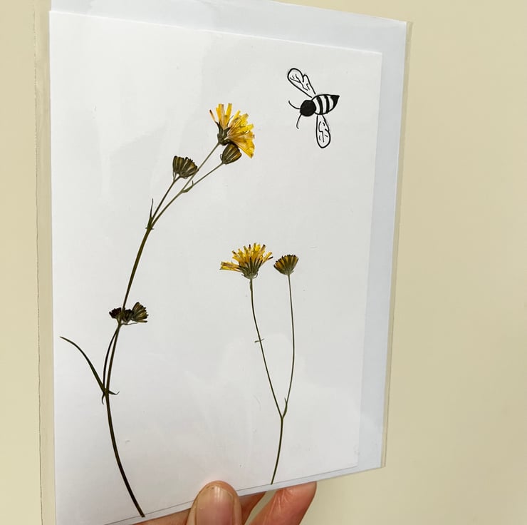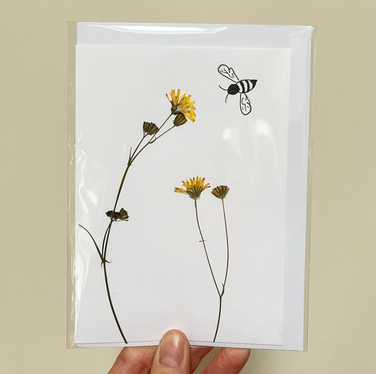 This lovingly handmade real pressed flower card is made using traditionally slow pressed yellow hawkweed a beautiful wildflower from our garden. Finished with a hand drawn bee.