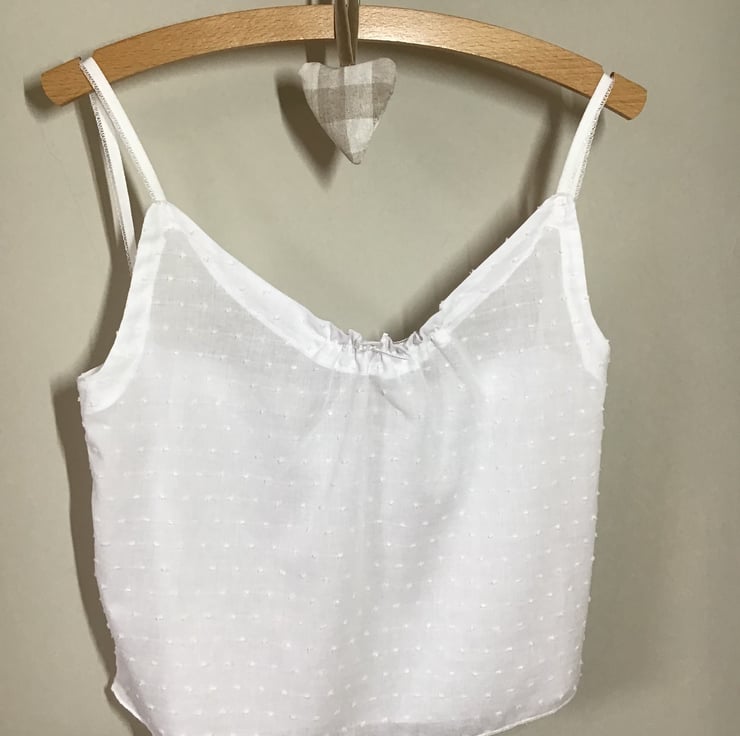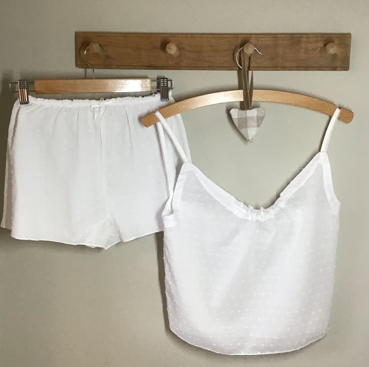 Add a touch of luxury to your every day with this vintage-inspired camisole and french knickers set, made in the softest textured swiss-dot cotton lawn, with hand tied bows. The camisole features elasticated straps and rouched neckline, the knickers are high-waisted and bias-cut for a gorgeous swing. Wear under skirts and dresses in the summer, or as a sleep set for a cool night's sleep. Handmade in Bristol.