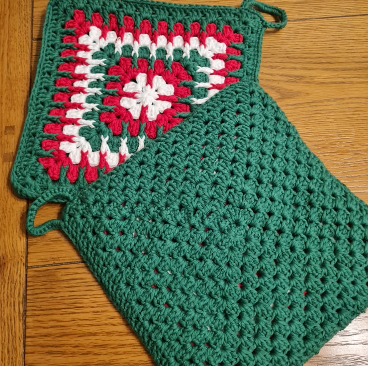 These are made with 100% cotton yarn They are safe to use on pots and pans on the hob, but I wouldn't recommend taking things out of the oven with them They have 2 layers to them as you can see by the picture the backs are made using one colour