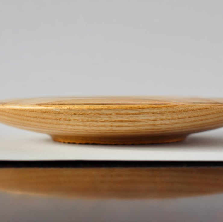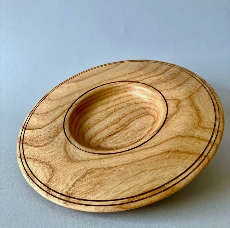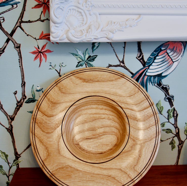 The undulating curves that flow through the warm, golden tones of this timber, showcase the striking natural beauty of the grain, whilst the carefully crafted domed rim, is beautifully accented by the contrast of the dark burn lines highlighting the edges.