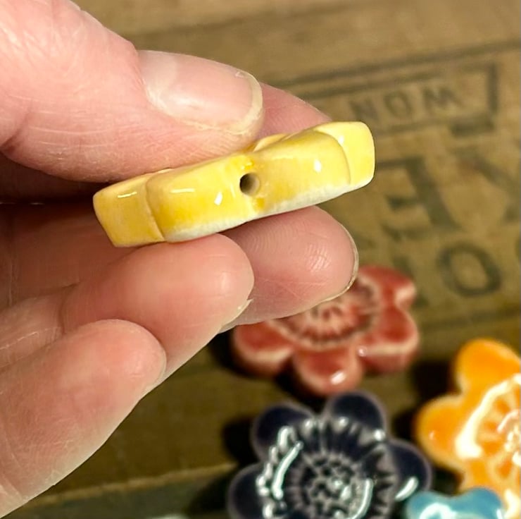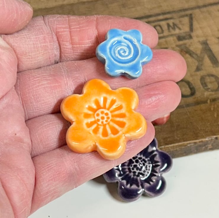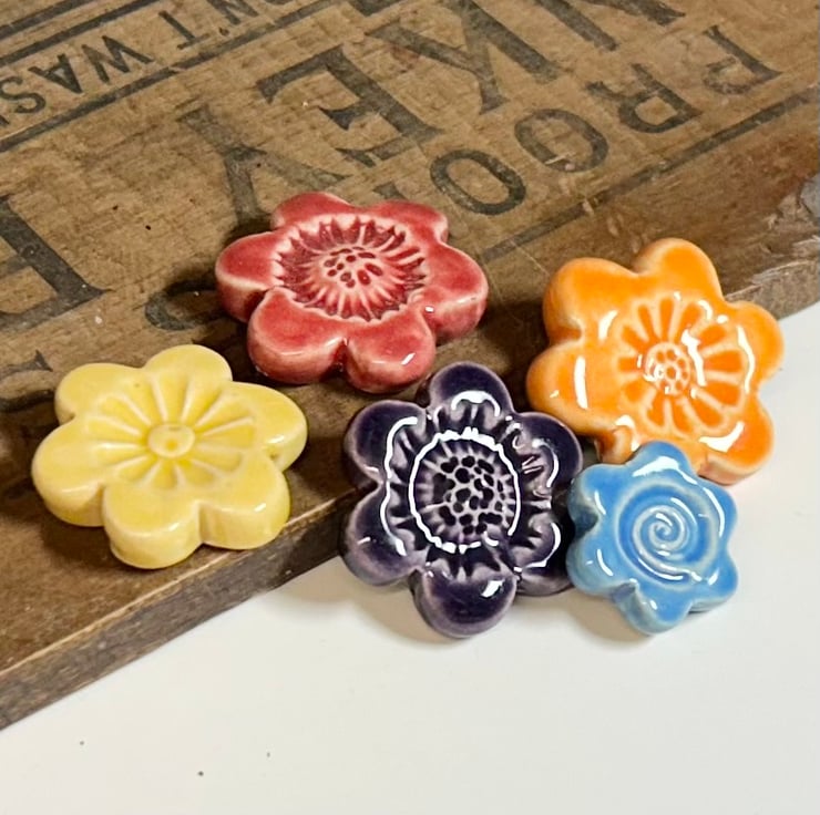 This set of five flower heads are made from white earthenware clay and glazed on the front with a glossy glaze. The back of each flower is plain ceramic. Each flower has a small hole at the bottom where a stick or wire could be inserted if you wanted to make a stalk for them. The hole is only 1.5 to 2 mm wide so it is quite small.
