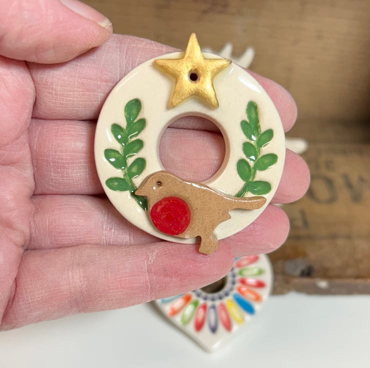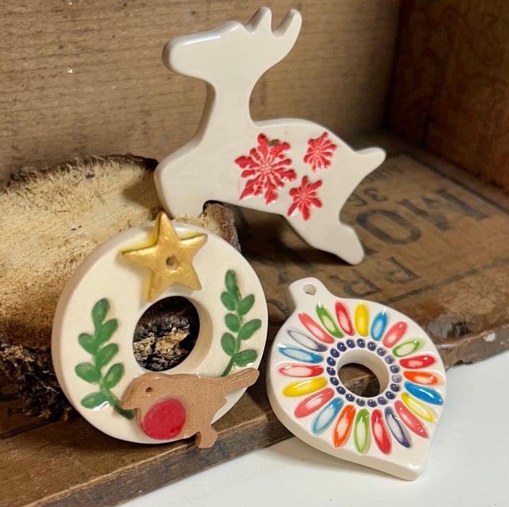 This set of three ceramic Christmas decorations are reduced because each one has a small flaw. The robin on a wreath has a wonky bird. The stag has a slight red smudge. The bauble decoration has won coloured section that is filled in.. Glazed on the front, plain cream clay colour on the back.