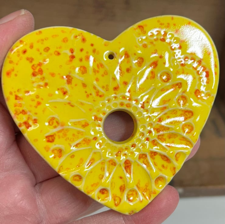This listing is for two perfectly imperfect heart hanging decorations. The reason that they are reduced is because the glaze is too thick on them. They are made from white earthenware clay, imprinted with pattern and finished with a bright, glossy glaze. They have been fired twice, once to the bisque stage and then a second firing for the glaze. They measure 7.5 centimetres wide and the same in height x 5mm thick. They can be hung outside.