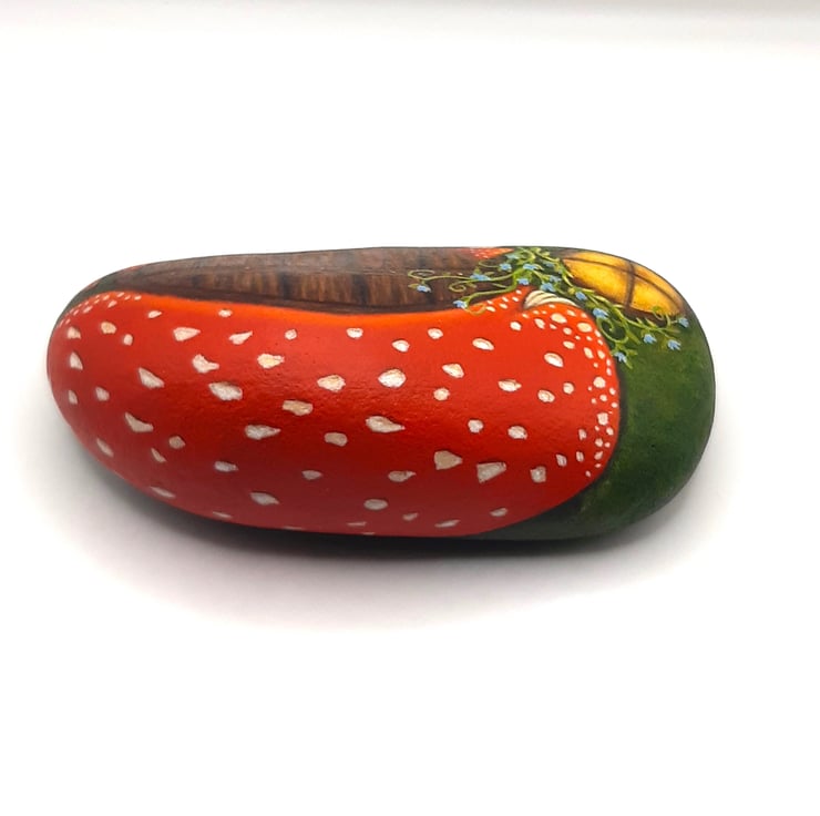 A rock hand painted with a mushroom fairy house.