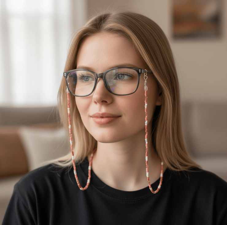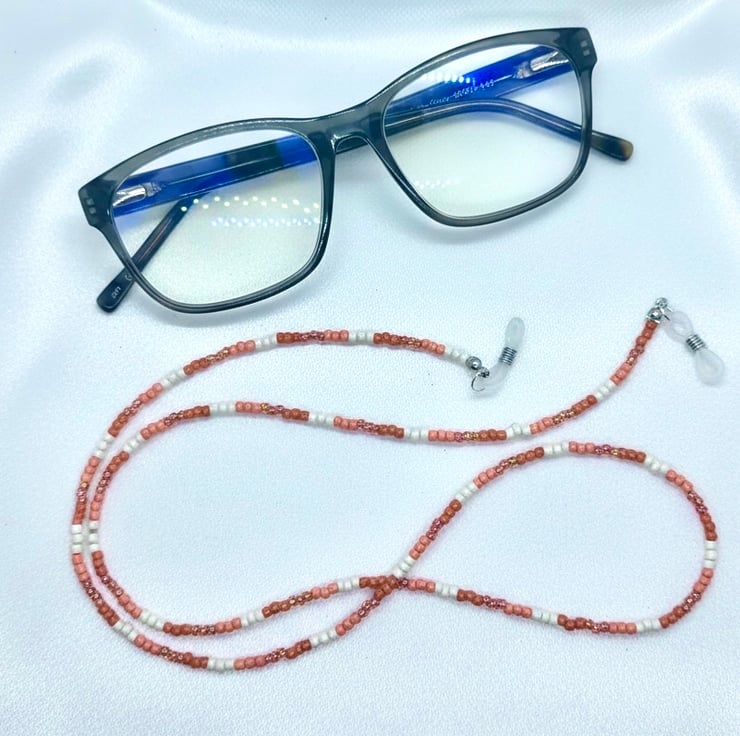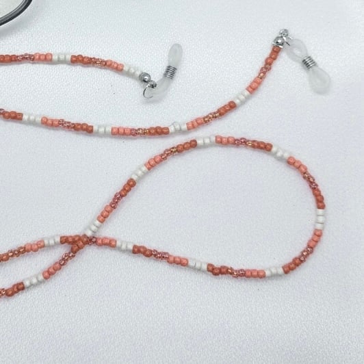 Add a touch of effortless style to your everyday look with this beautifully handcrafted seed bead glasses chain. Made with delicate seed beads in soft peachy-coral and white tones, this 27-inch chain is lightweight, comfortable, and perfect for all-day wear.