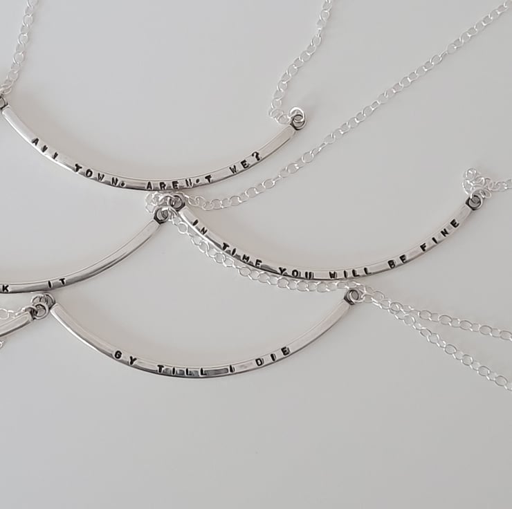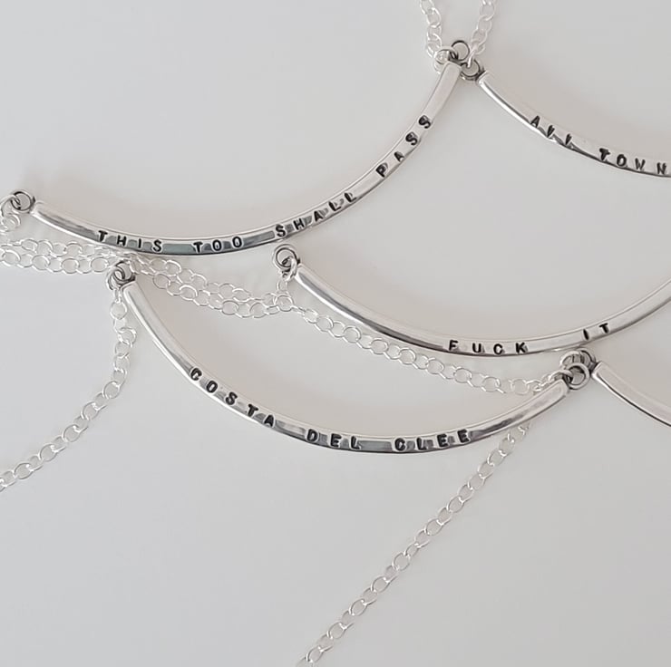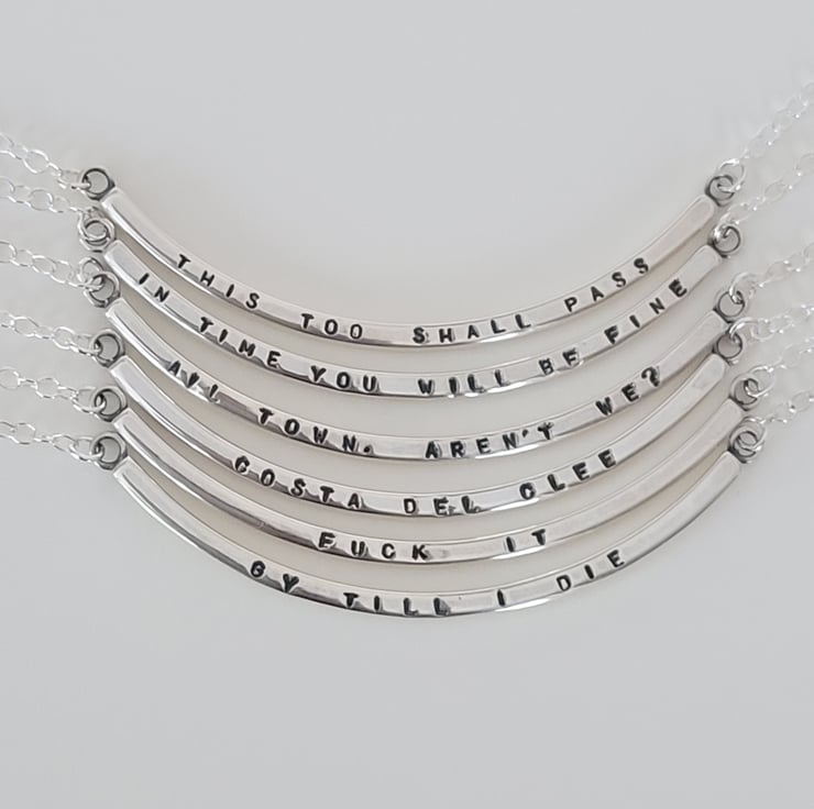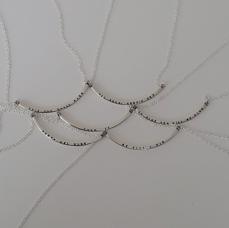 12 handmade recycled sterling silver curved bar necklaces, with personalised messages.