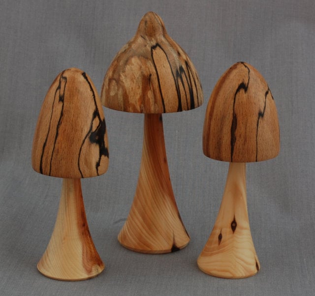 Uniquely marked toadstools, completely natural markings created by nature over time. The tops are turned from spalted beech and the stems from home-grown English yew. The set measures aprroximately 11.5 cm x 10cm wide for the tallest and 9.5 tall x 3 wide for the shortest.