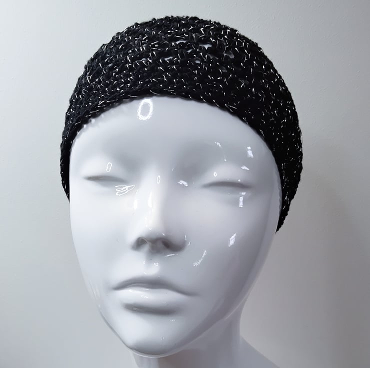Inspired by the boho chic and disco styles of the 1970s, this black and silver sparkly crochet skull cap will put you in the party mood.