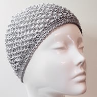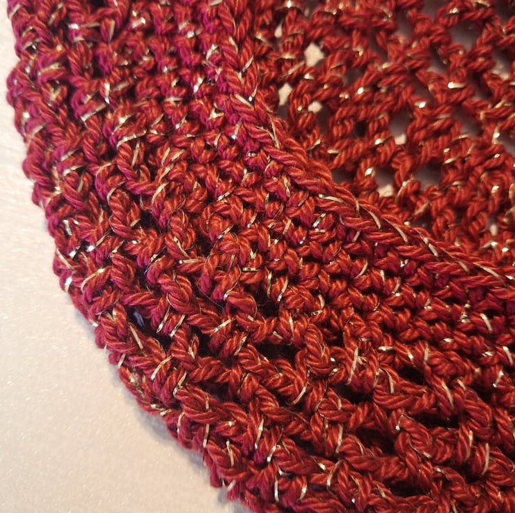 Inspired by the boho chic and disco styles of the 1970s, this red and gold sparkly crochet skull cap will put you in the party mood.