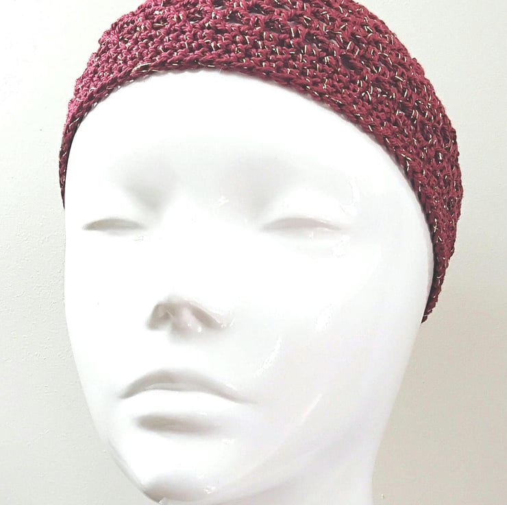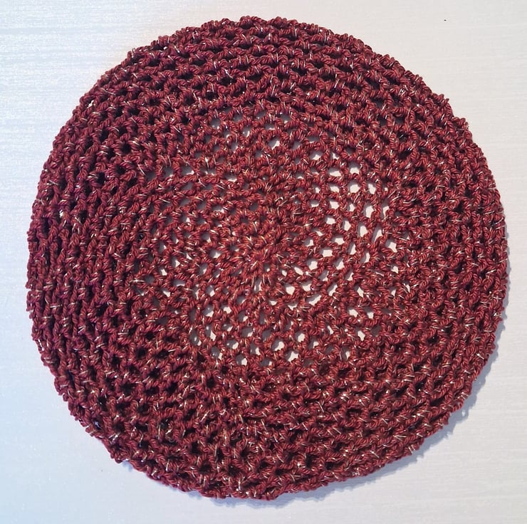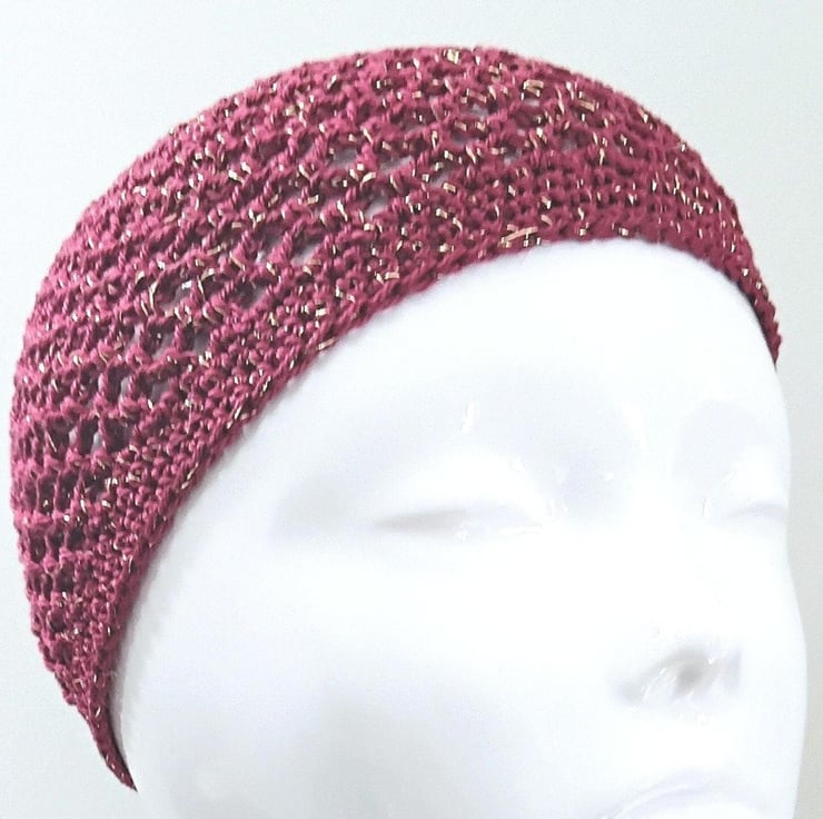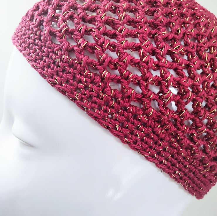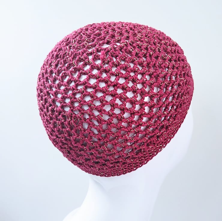 Hand crafted with high quality, fine 100% cotton yarn, this dark red skull cap also has a gold metallic thread working throughout the design for extra sparkle.