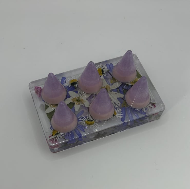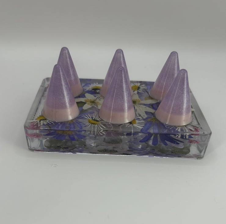 Each of the six resin cones is individually poured, with layers of white, purple and pink flowers arranged carefully between the resin. The amethyst and rose quartz chips add gentle sparkle.