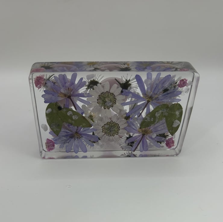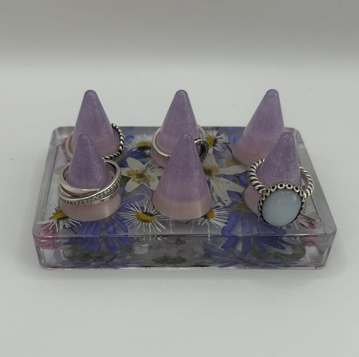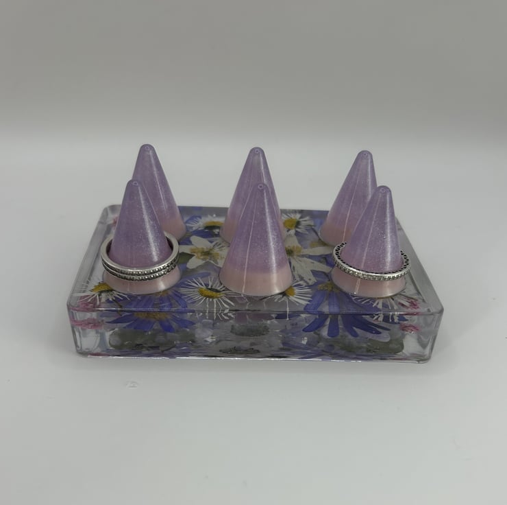 This handcrafted resin ring holder is made with real pressed flowers and genuine amethyst and rose quartz chips, creating a soft lilac to pink gradient that catches the light beautifully. It is a thoughtful Mothers Day gift or a lovely way to display your favourite rings.