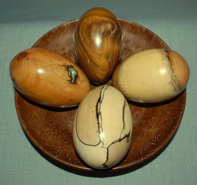 Tactile and visually pleasing, this selection of hand turned eggs are made from English laburnum (locally sourced), English yew (homegrown), and English spalted beech.