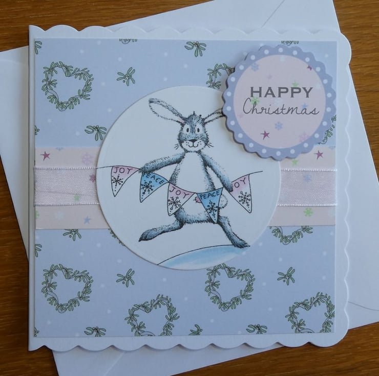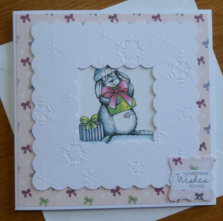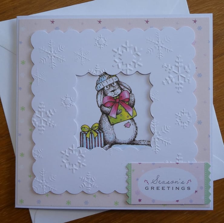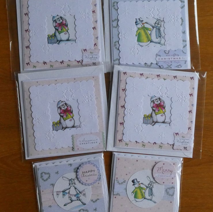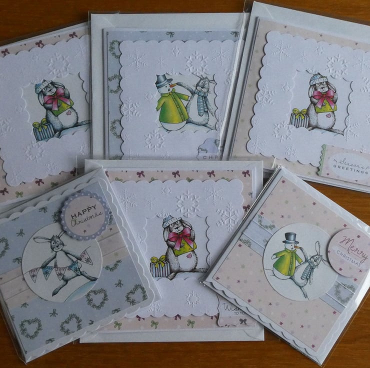 The designs all feature a cute grey and white rabbit with either a snowman, Christmas bunting or a pile of gifts. The larger cards (approx 15cm square) have embossed snowflake frames and the smaller cards (12.5cm) have scalloped edges. All of the cards come with white envelopes.