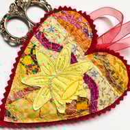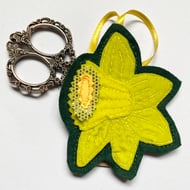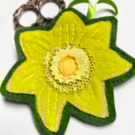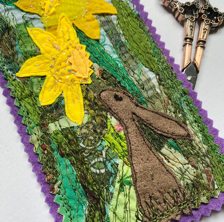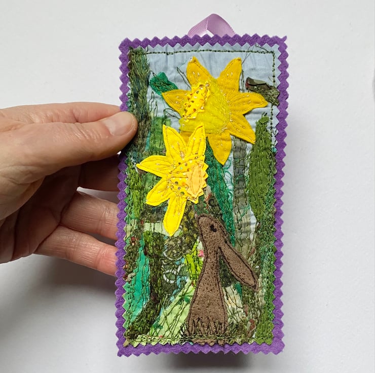 This adorable embroidered rabbit home decorations shows a rabbit enjoying the sweet smell of spring daffodils. It has been made from up-cycled fabrics and stitched down with free motion embroidery. It comes felt backed and measure approx 8.5x 16cm, with the ribbon the length is 26.5cm.