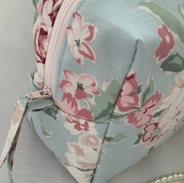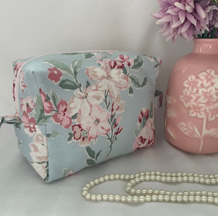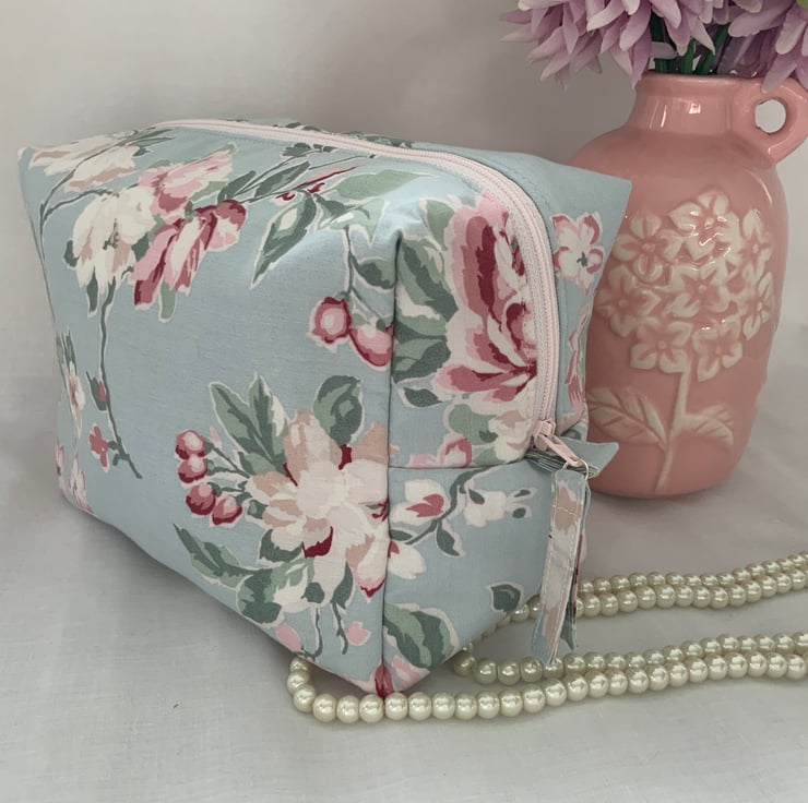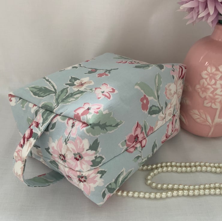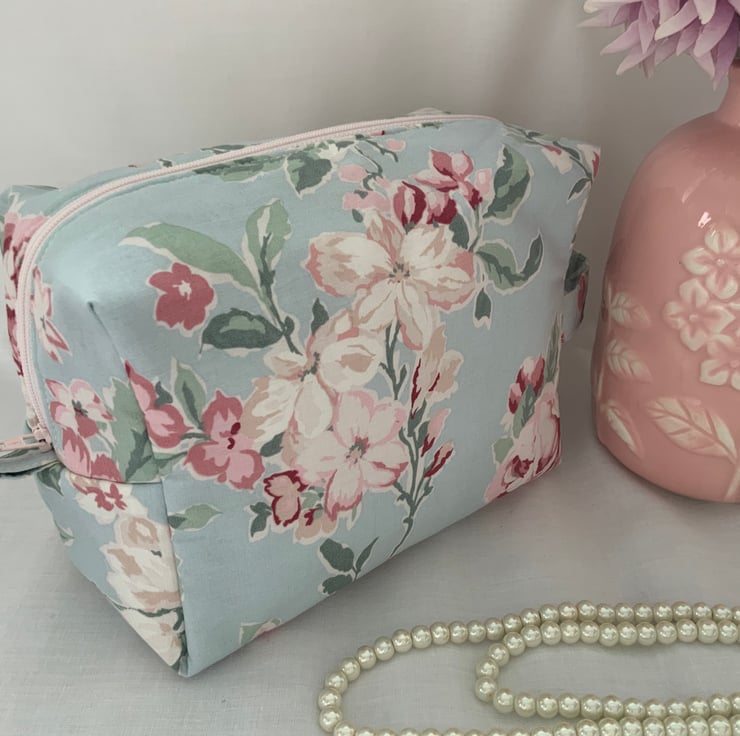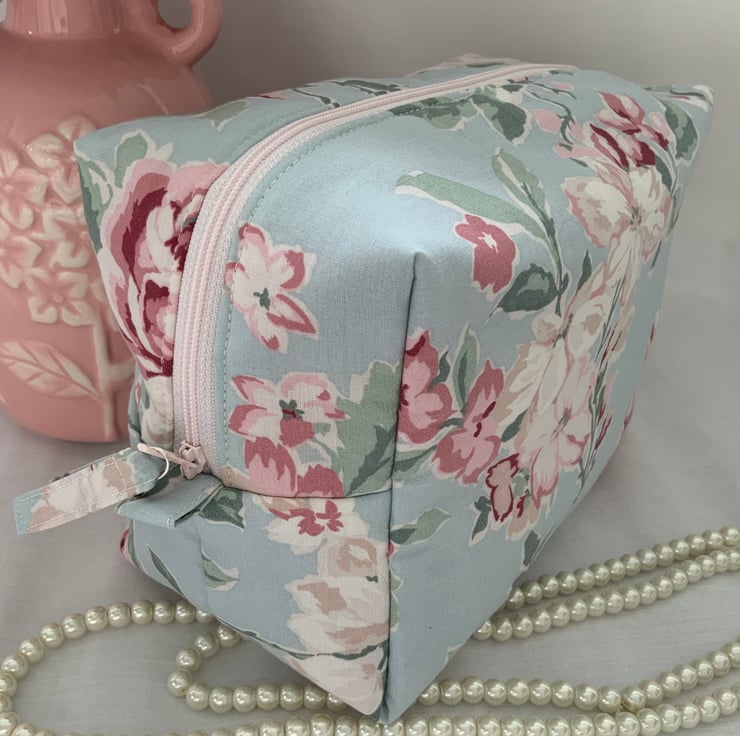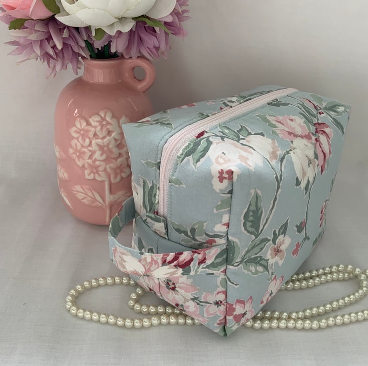 A pretty boxy toiletry bag / wash bag complete with handle and tabs. Perfect for storing your toiletries or cosmetics. It would look stylish on display in a bathroom or on a dressing table but also perfect as a travel accessory to carry your toiletries or cosmetics. This bag is interlined to give it a light padded structure and is lined with pink cotton fabric. The zip is finished with a handmade fabric pull.
