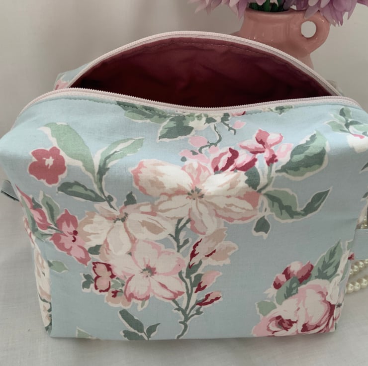 Boxy Toiletry bag, large cosmetic bag, travel bag made from a pretty, soft, velour type fabric.