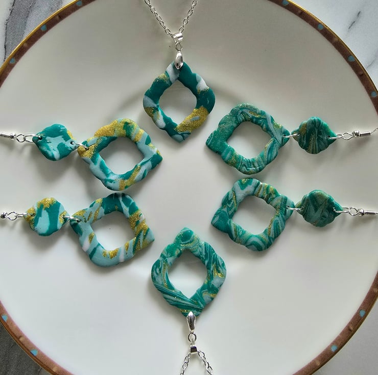 A pair of dangle earrings lovingly made with polymer clay. All earrings come on silver plated ear hooks and are presented in tissue and in an organza bag ready to gift to yourself or someone else.