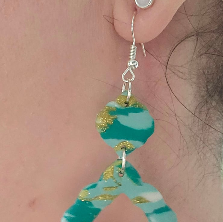 Polymer clay dangle green and gold earrings on silver plated earhooks