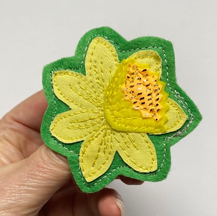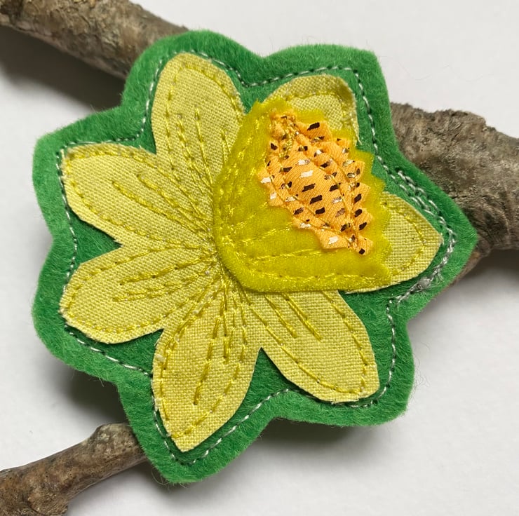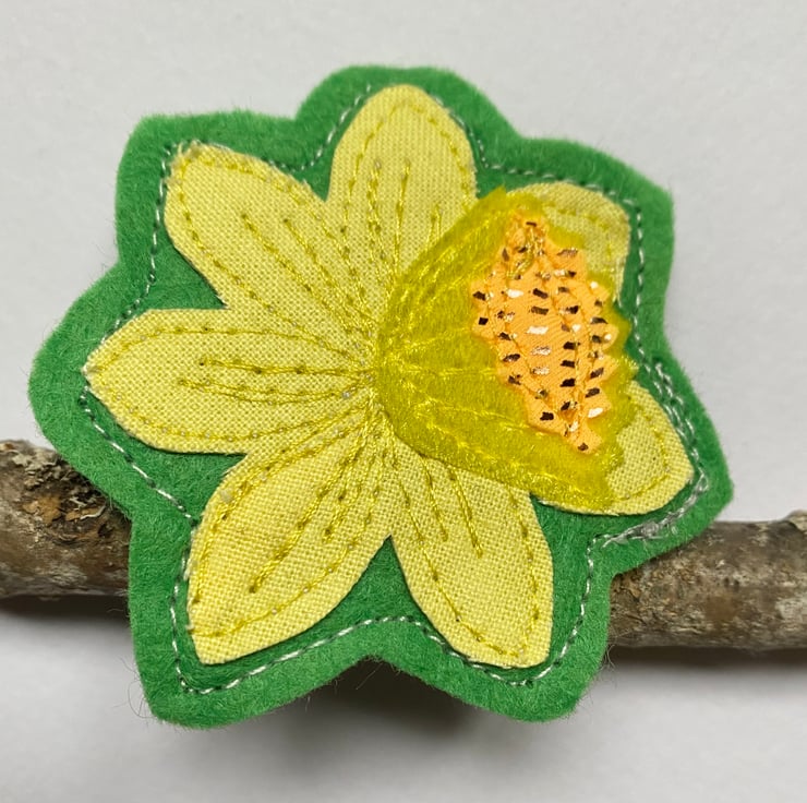 This sweet handmade free motion embroidered yellow primrose and leaf brooch is made from up-cycled fabrics. It is felt backed, and has a brooch pin with hook on the reverse to keep it nice and secure. It measures 7cm approx.