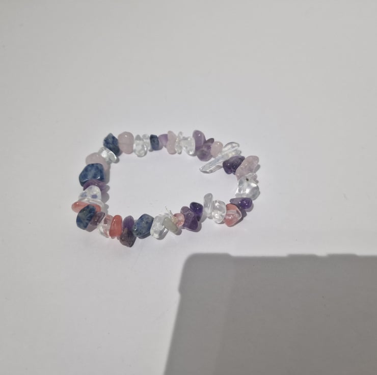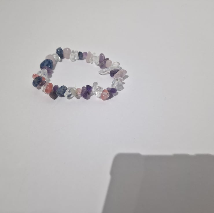 Crystal stone gemstone bracelet. Purple, pink and clear stones, the stones are 5-8mm size. Held together by 0.6 size jewellery string.