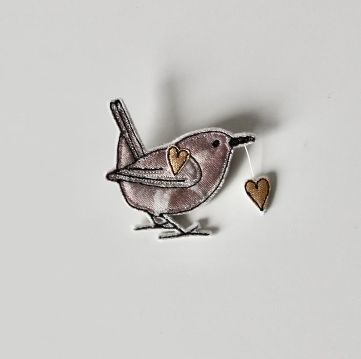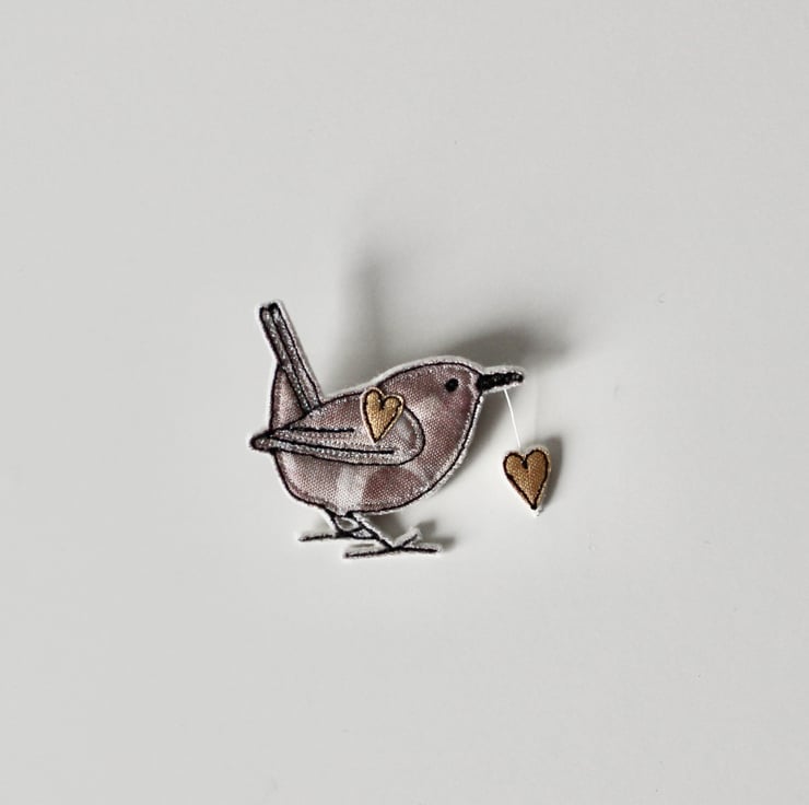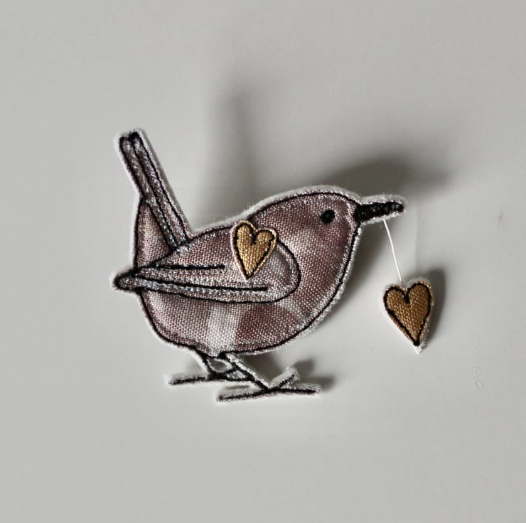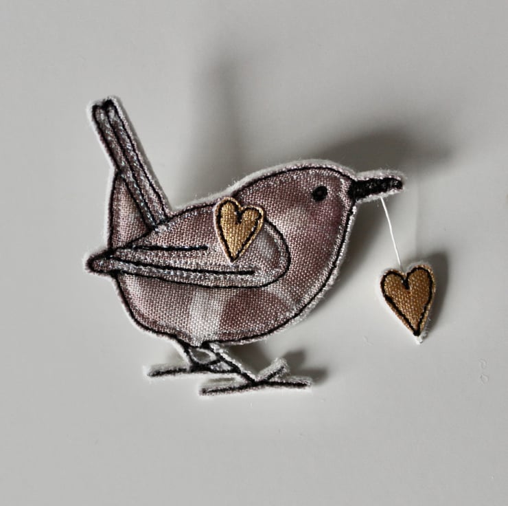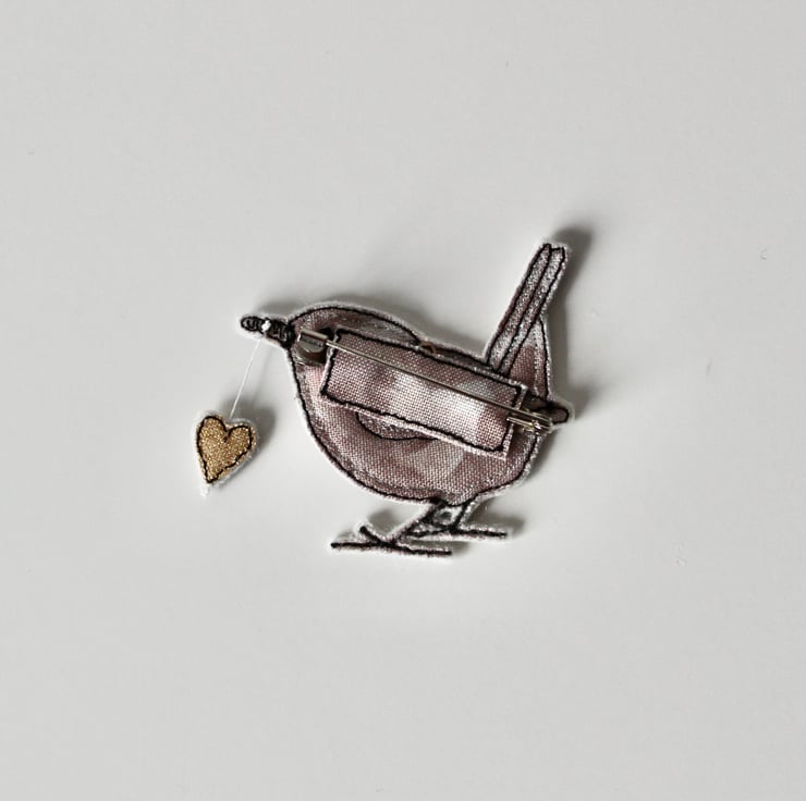 'Jenny Wren' brooches are sewn using cotton cloth, 100% wool felt and free hand machine embroidery; multiple layers of cloth are sewn together and cut out by hand using sharp scissors. With a pin on the back, attached with hot glue with a sewn fabric rectangle to secure.
