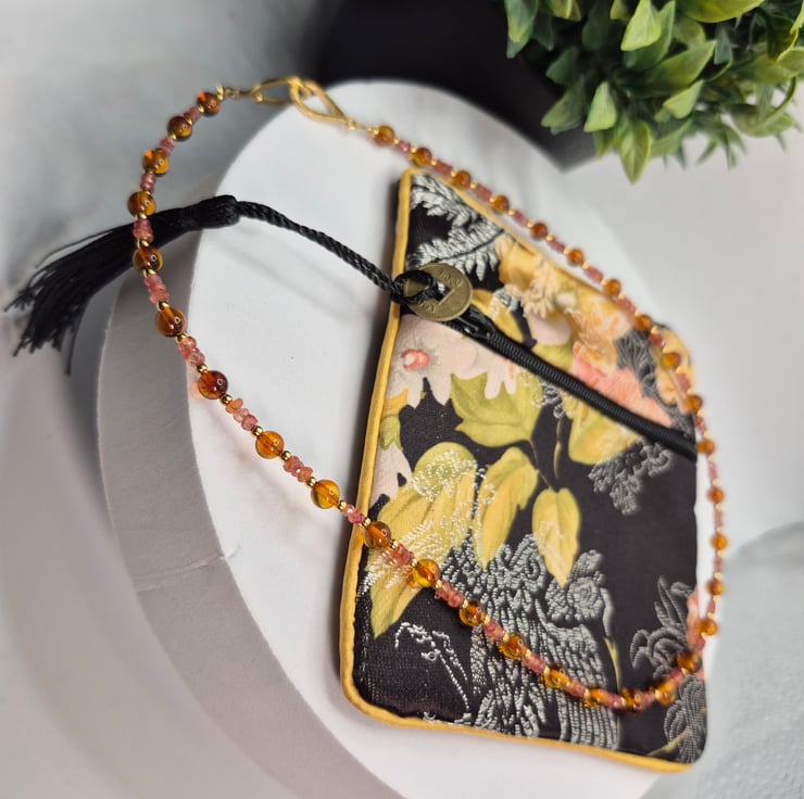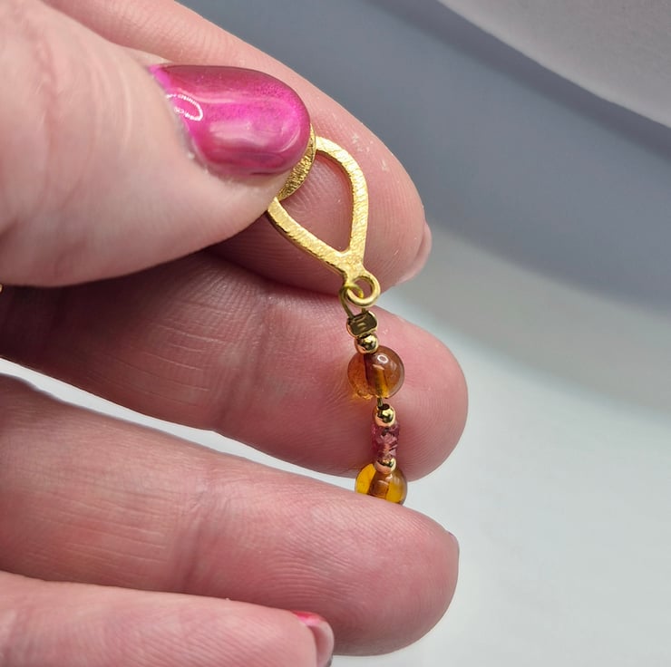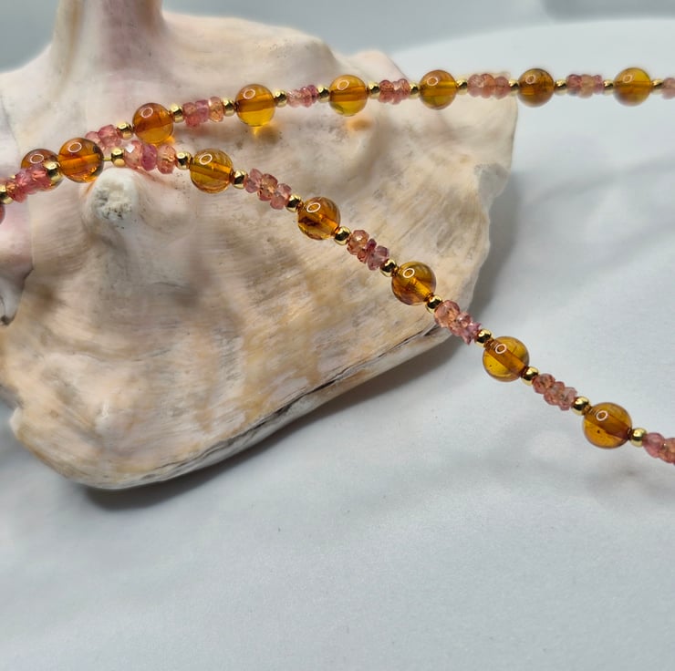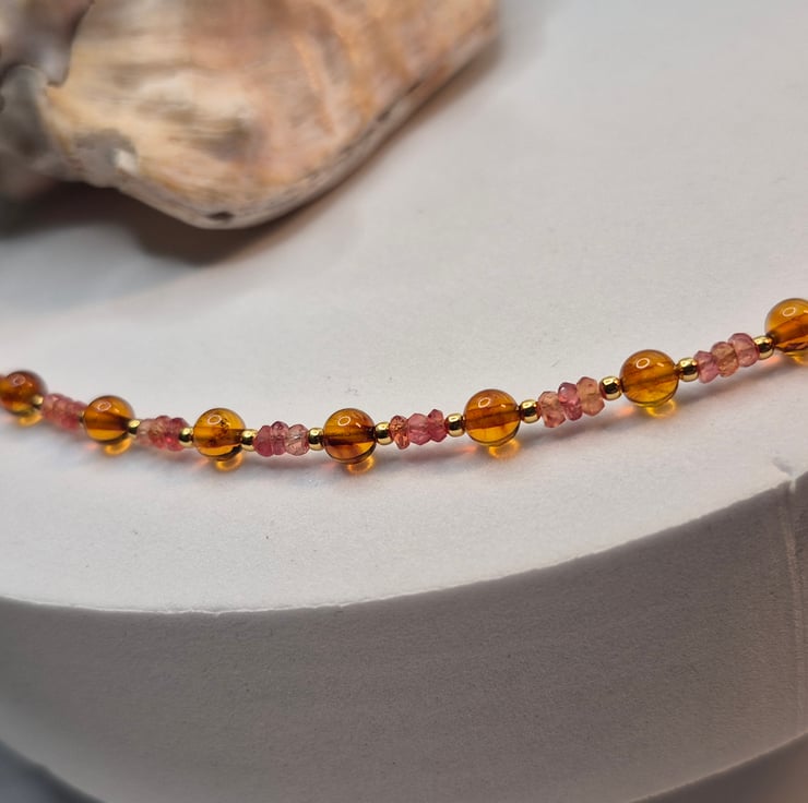 The necklace is finished with a brushed effect sterling silver gold plated hook and loop clasp, (not hallmarked). The combination of soft sunset-toned sapphires, honeyed Baltic amber and warm gold creates a beautifully balanced piece that feels both elegant and organic.