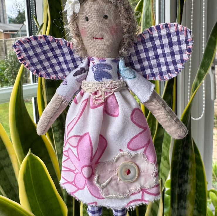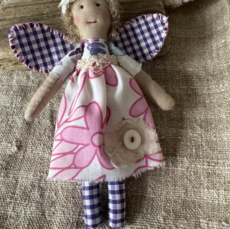 She has a vintage 1970's pink dress, handmade wings and vintage lace/button detailing. I have created her hair from a mohair mixed yarn
