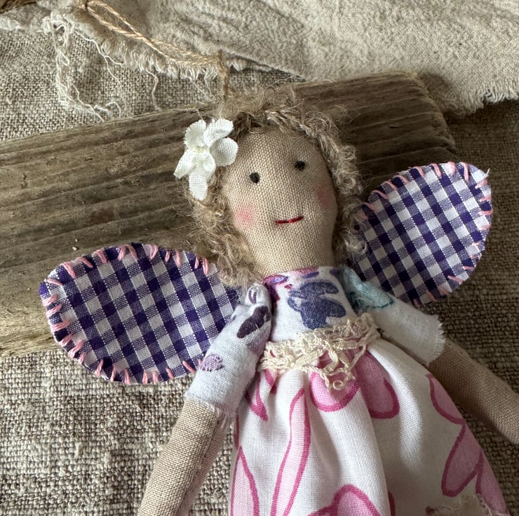The body has been stitched using my vintage Singer sewing machine, the clothes and wings are slow stitched using deliberate, gentle hand stitching