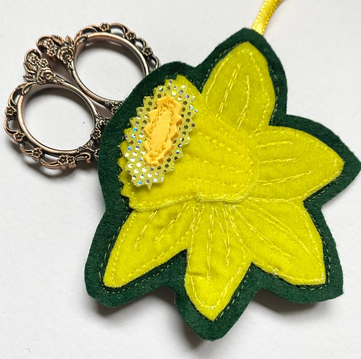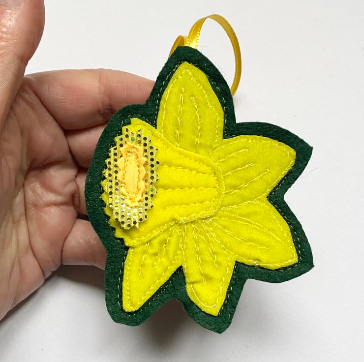 This cheerful embroidered home decorations shows a beautiful bright spring daffodil. It has been made from up-cycled fabrics and stitched down with free motion embroidery. It comes felt backed and measure approx 8 x 10cm, with the ribbon the length is 18.5cm.