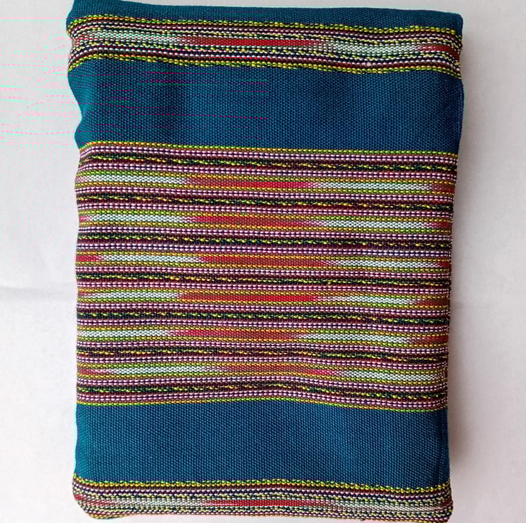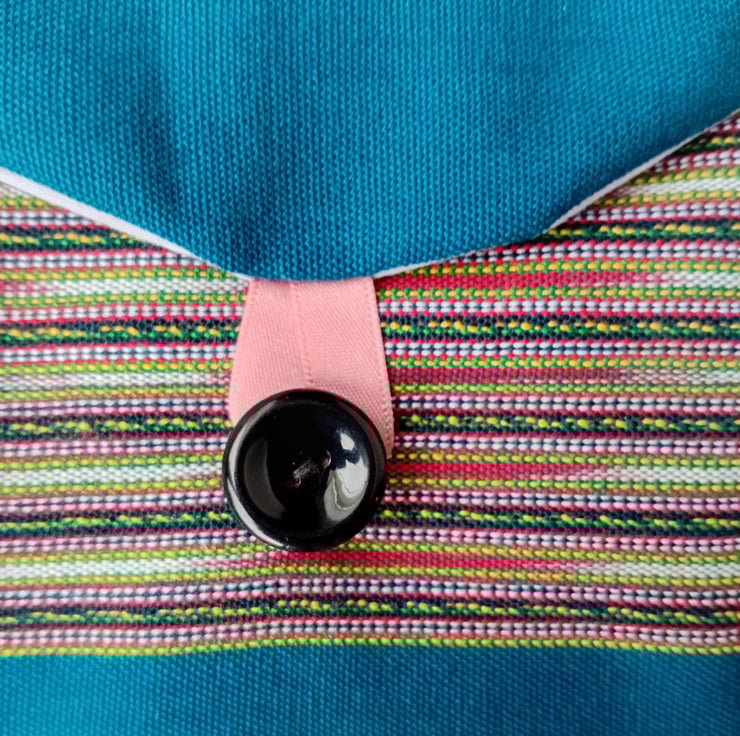 Made in a beautiful woven multicoloured material. The person who gave this remnant to me said it came from India, and it certainly looks like it.