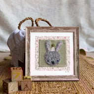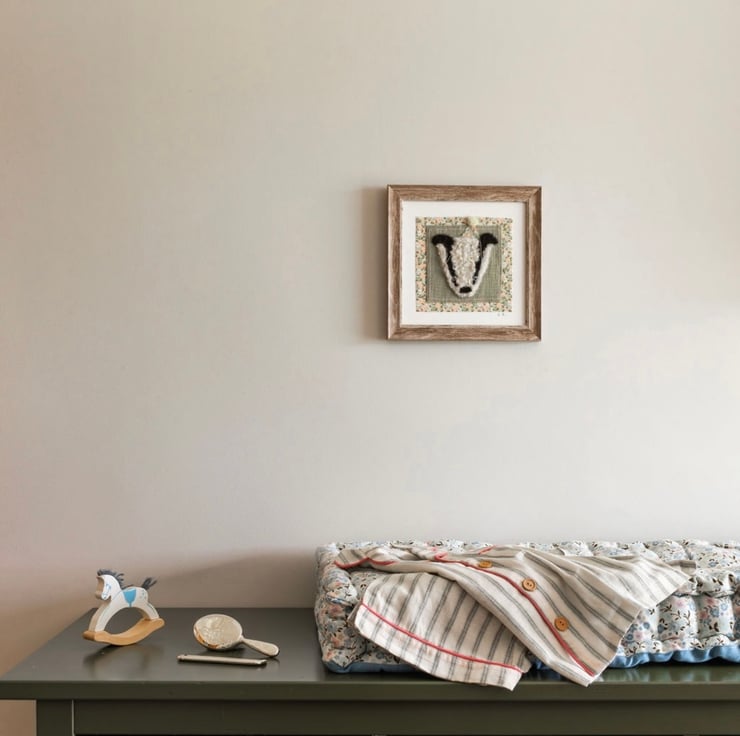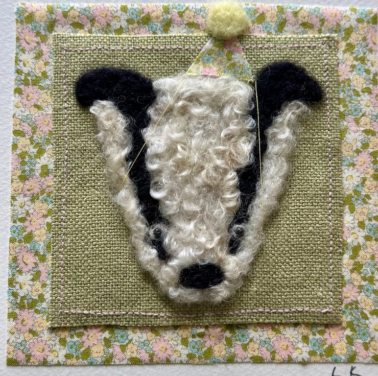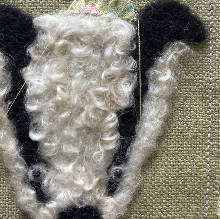 Needle felt mounted on french linen and pretty floral cotton .