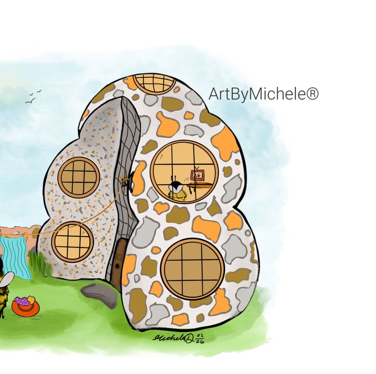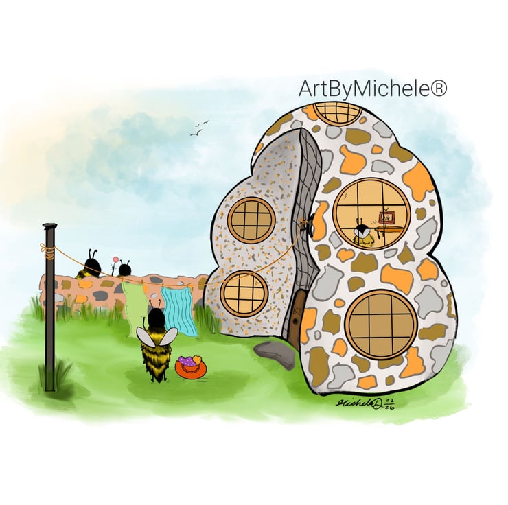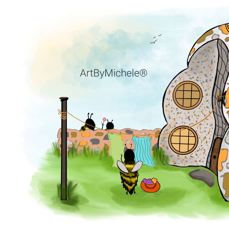 Another piece displaying the wonderful whimsical world of bees! This one features a cute bee cottage with the family enjoying the mild weather, perfect for washing day.