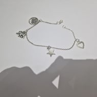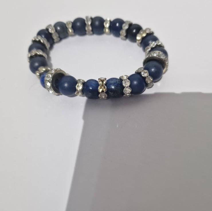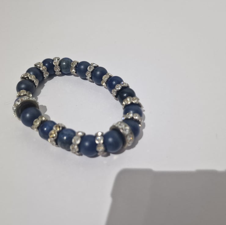 Crystal diamante bracelet, with navy plastic bead, small size and metal diamante ring beads. The beads are medium size . Held together by 0.6 size jewellery string.