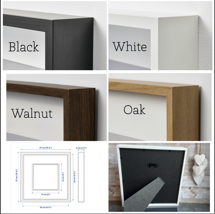 Made from: Mounted inside a deep box frame with a safe perspex front and available in black, white, oak or walnut. Frames measure 27cm x 27cm x 6cm and can stand or hang.