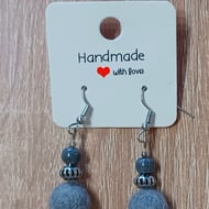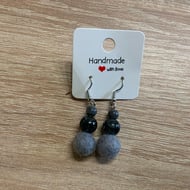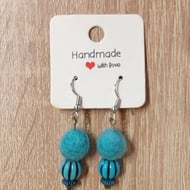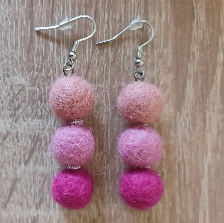 Handmade felt ball earrings. Drop measures 6cm in total. The three felt ball drop measures 4cm. Lovely lightweight earring with graded pink tones.