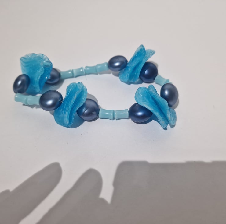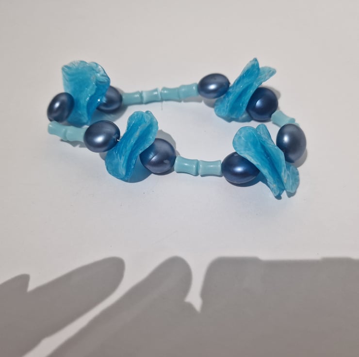 Unique style bracelet with three different beads, light blue disc bead, small column beads and navy beads. All plastic different sizes. Held together by 0.6 size jewellery string.