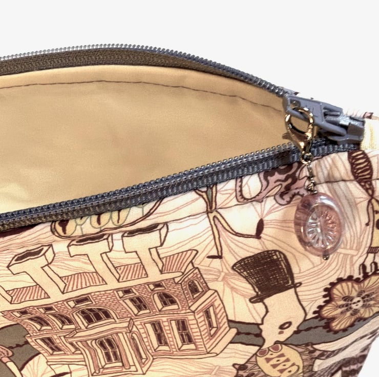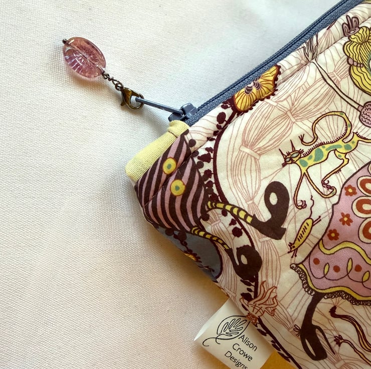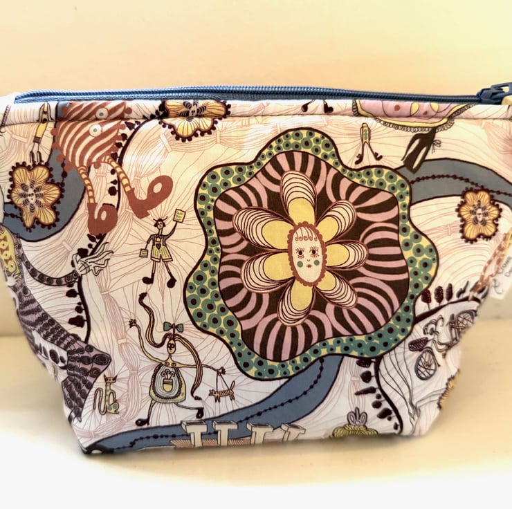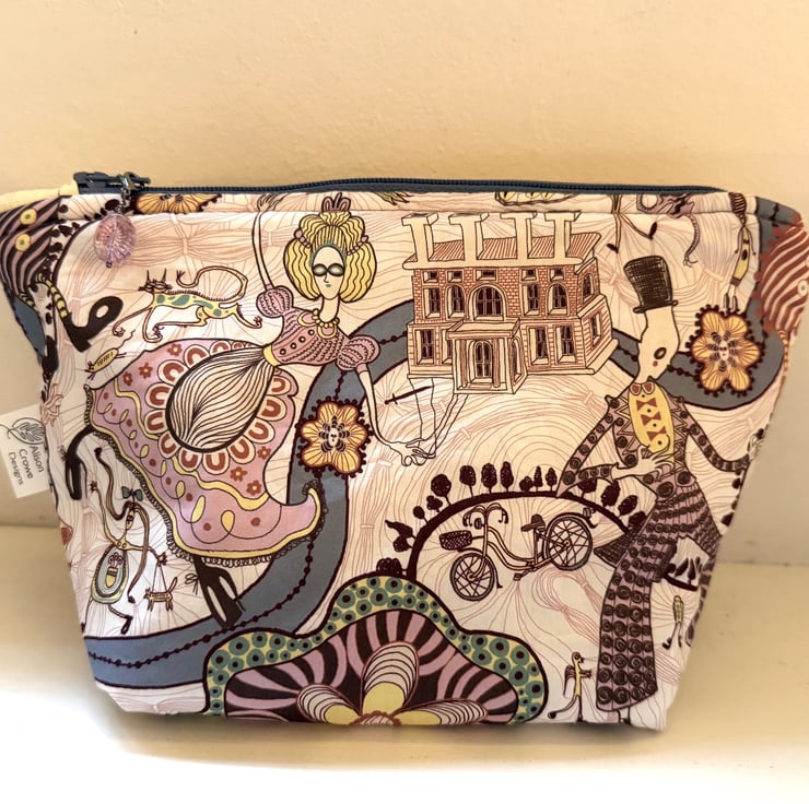 Handmade zipped accessory bag created using the artist Grayson Perry's fabric design for Liberty of London. The outer fabric is Liberty's beautiful Tana Lawn cotton and it has a Czech glass beaded zip pull closure (detachable) The lining is yellow cotton fabric. Dimensions: 22 x 16 x 8.