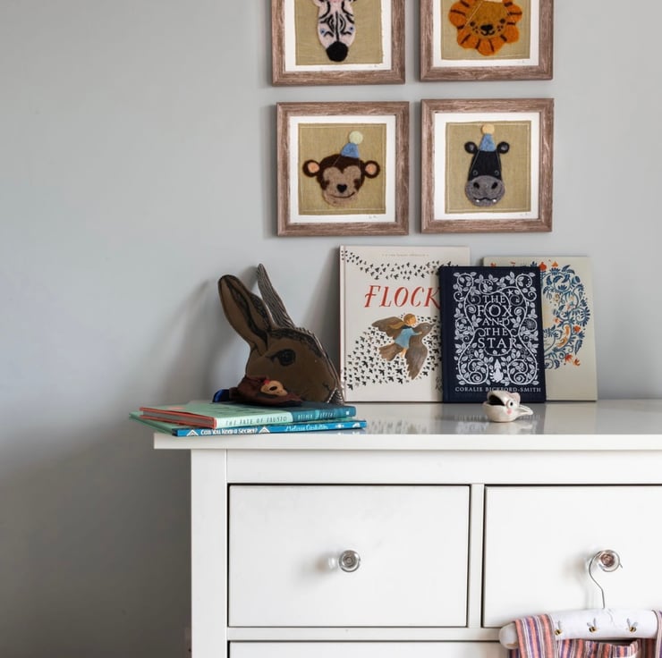 As seen in Country Living Magazine, this adorable, handmade pice of unique nursery art is made using needle felt technique.