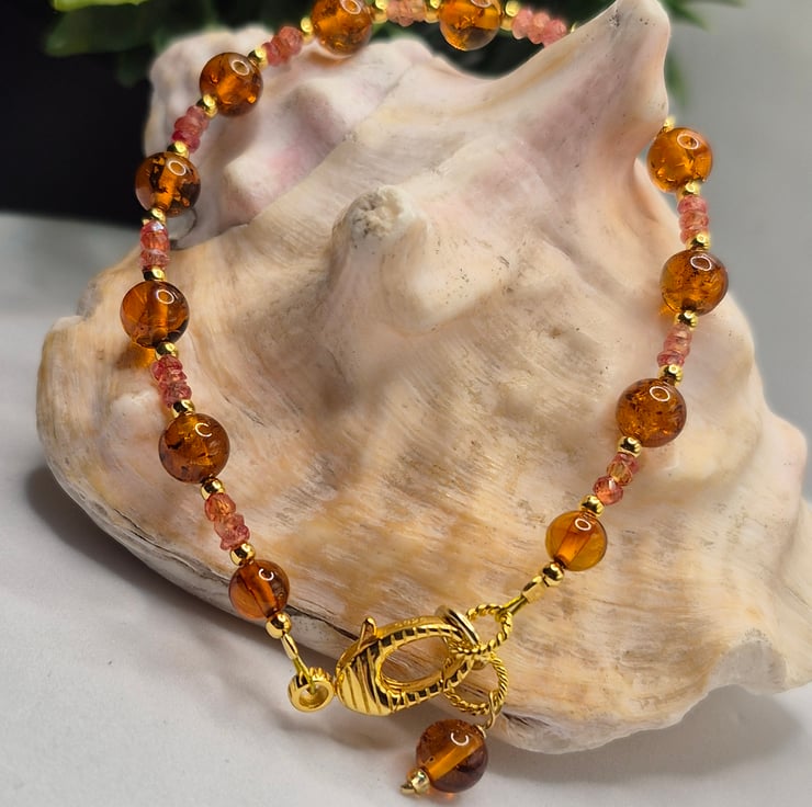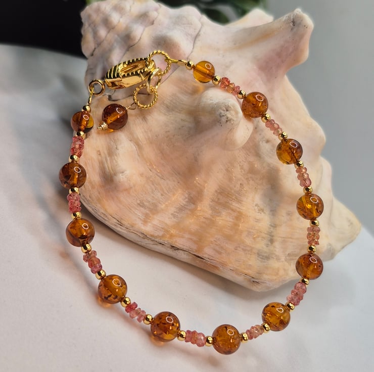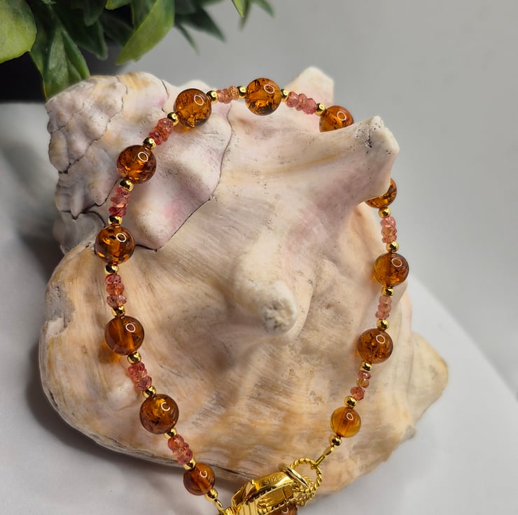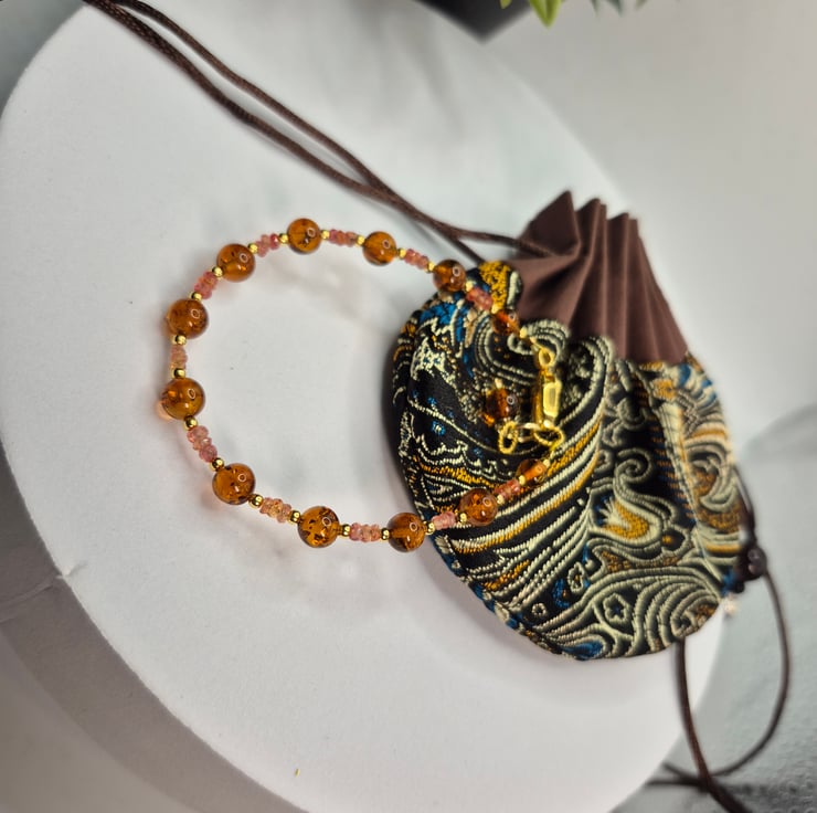 This one-of-a-kind luxury bracelet is crafted on professional beading wire and measures up to 7.5 inches in length. It features 2–3mm faceted Padparadscha sapphire rondelles in vivid orangey-pink hues, paired with glowing 5mm and 6mm Baltic amber beads. Fine 2mm gold-plated sterling silver accents add warmth and cohesion throughout the design.