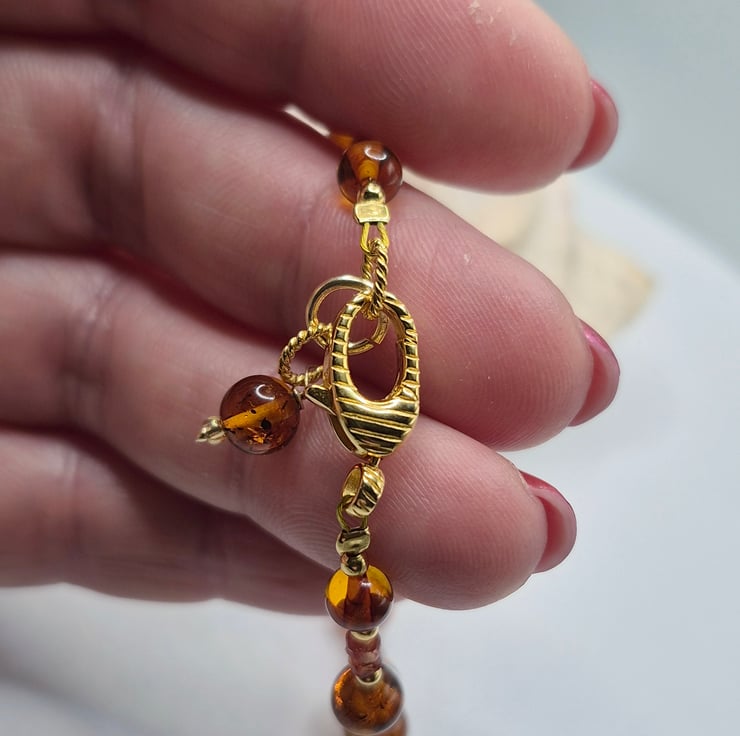 The bracelet is finished with a textured 16x9mm gold-plated sterling silver lobster clasp (925 stamped) with extender for a secure and adjustable fit. The vibrant sapphires combined with rich honeyed amber create a radiant yet balanced piece that feels both bold and timeless.
