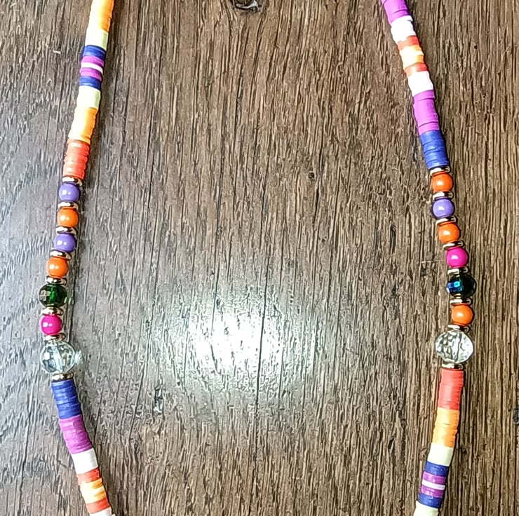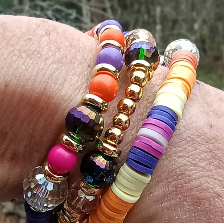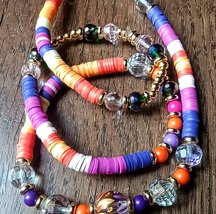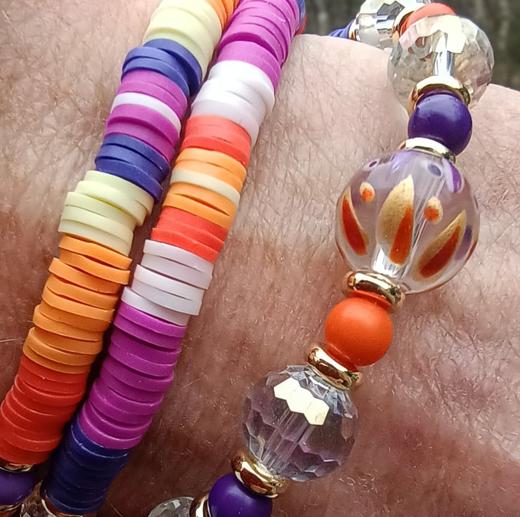 This listing is for a OOAK vibrant and colourful stretchy beaded necklace called "Twin Flame". A unique creation made using tones of purple and orange polymer clay beads combined with clear multifaceted beads, purple, fuchsia and orange small beads, gold coloured spacer beads which coordinate with the central painted bead.