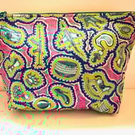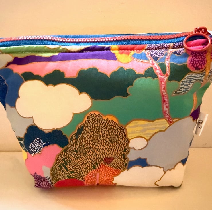 Zipped Accessory bag made with this beautiful Liberty of London Tana lawn cotton fabric. 'Prospect Road' depicts a colourful scene reminiscent of designs of the 1930s. Ideal storage for all your important bits and bobs. Lined with pink cotton fabric and closed with a ring zip pull - a really individual and eye-catching accessory.