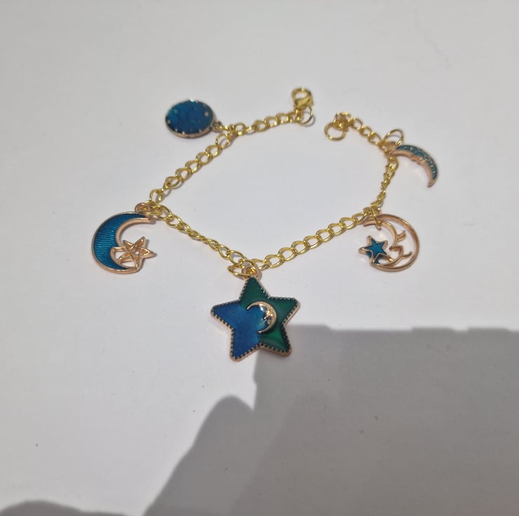 Mixed charm gold bracelet in a sky theme in gold with blue enamel. The bracelet has moon, planet and star charms Charms are made from a zinc alloy lightweight sturdy and do not fade easy. All charms are secured via jump rings on a gold plated chain. Bracelet has a gold plated lobster closure.